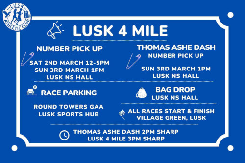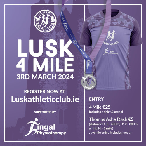 Hosted by Lusk AC this race is an Athletics Ireland permitted road race. It will be a chip timed 4 mile race through the streets and roads of Lusk.