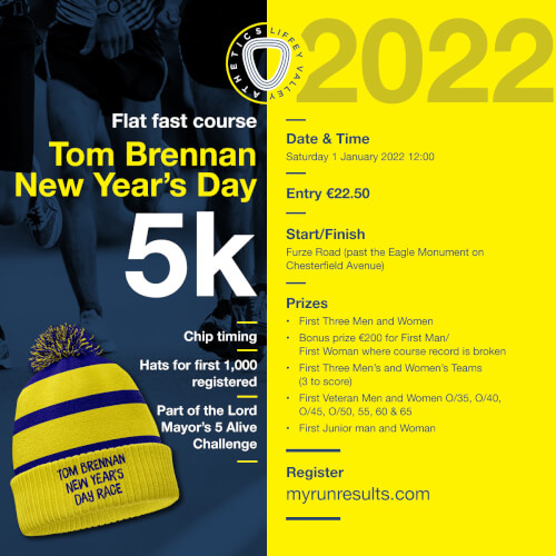 Kick off your 2022 in fine style in the Phoenix Park as you run, jog or walk the Tom Brennan Memorial 5k race. With our usual professionalism and trademark warmth and welcome, Liffey Valley AC is delighted to welcome you back to this flat, fast, pb-friendly course. One of the Phoenix Park's longest running events, we guarantee you an enjoyable morning and the ideal start to your new year.